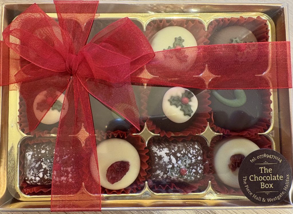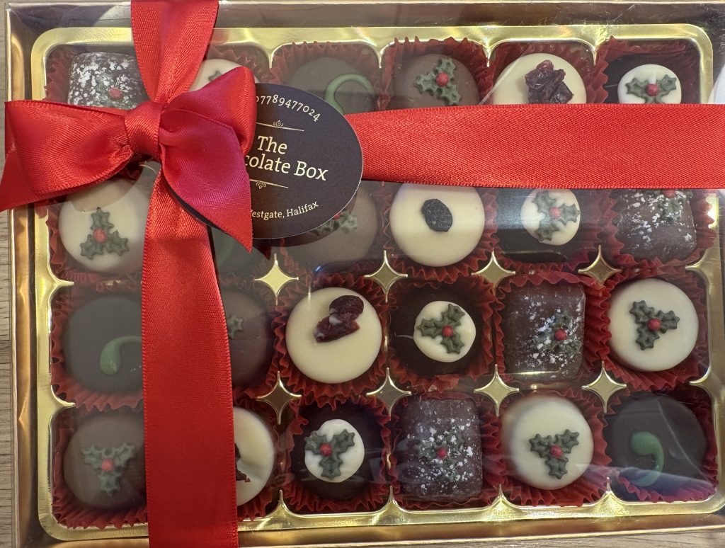 Selection of 12 handmade English Chocolates in gift box with ribbon & tag